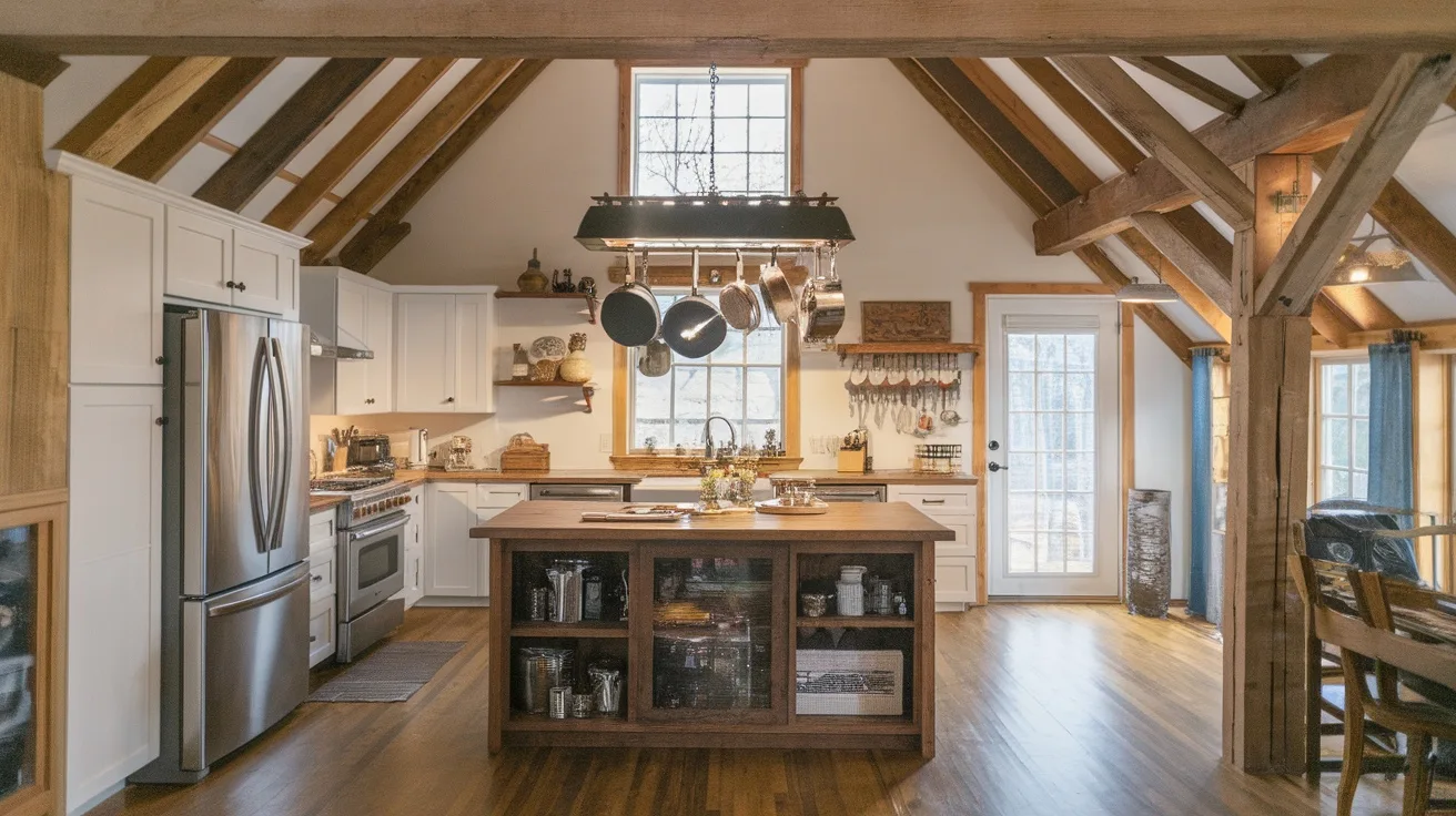 The kitchen features a large island, perfect for meal prep or casual dining. The wooden accents and beams add warmth, creating a cozy atmosphere. Plenty of storage is available with cabinets and shelves, keeping everything organized and within reach.