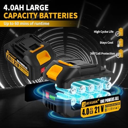 JEXUGK 21V brushless cordless palm router – compact, powerful and precise. Comes with 2 x 4.0Ah batteries for extended runtime, 6-speed control and 20 1/4″ bits. Portable, easy to handle for pro woodworking results.