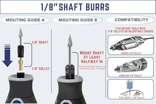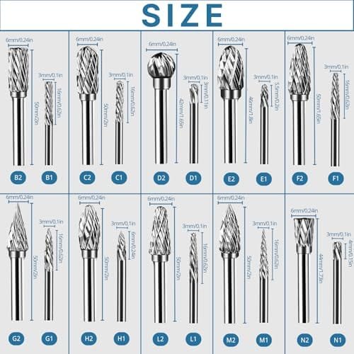 20-piece double-cut carbide burr set with 1/8″ shank and 2 collets — compatible with Dremel. Fast, precise material removal on metal, glass and wood for drilling, carving, engraving, polishing and cutting. Durable, clog‑resistant, versatile.