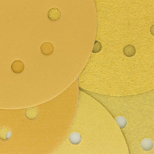 The gold abrasive coating reduces clogging when sanding softer woods or paint. Coupled with the 8-hole layout and our shop vac, we noticed finer dust levels around the work area and reduced abrasive loading. Less clogging also meant the discs stayed effective longer between replacements.