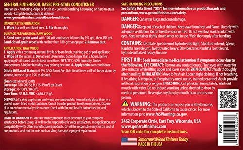 General Finishes Oil-Based Pre-Stain Wood Conditioner, 1/2 pint: primes wood for even stain absorption, reduces blotchiness on softwoods, and ensures a smoother, more professional finish.