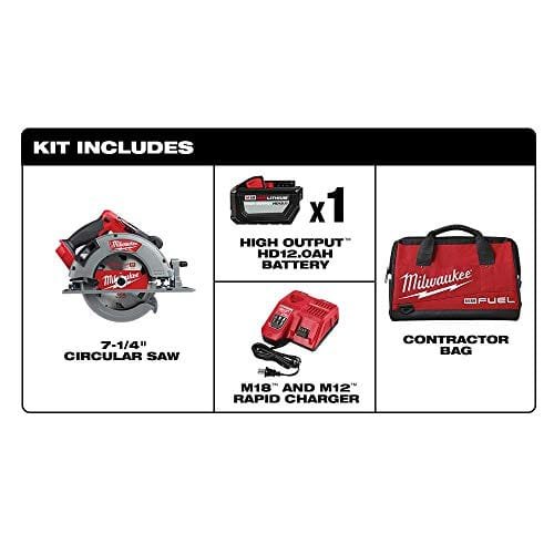 Milwaukee M18 FUEL 7-1/4″ cordless circular saw kit — POWERSTATE brushless motor for faster, cooler cuts; REDLITHIUM 12.0Ah battery delivers pro-level runtime; includes charger and tool bag for portable jobsite power.