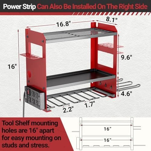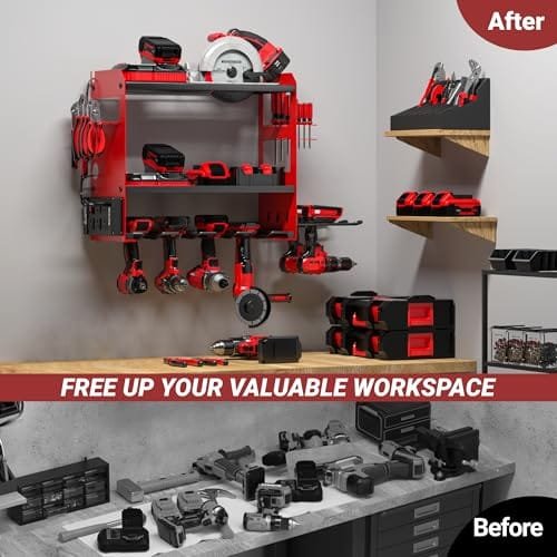 YYR Power Tool Organizer — heavy-duty red wall-mount with built-in metal power strip. Hangs cordless drills, stores batteries and chargers, frees bench space and keeps tools charged and ready.